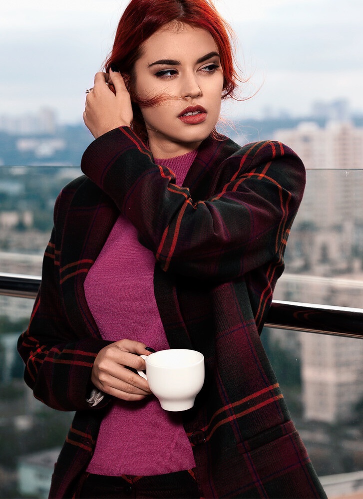 Take a look at the photo. In this outfit, Olia successfully combined a pink sweater with a burgundy checked blazer. All these shades are close to each other on the clothes color wheel and blend well. Additionally, the singer's hair plays a vital role in the outfit. Her bright red hair and makeup accents complement the outfit, creating good color combinations for clothing.
