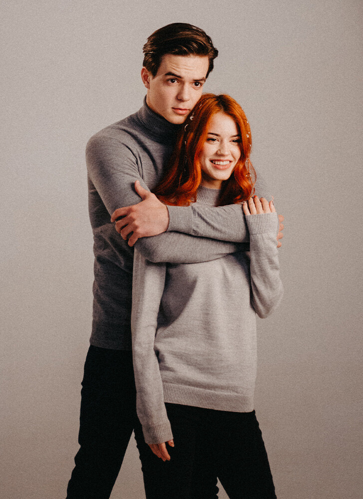 In this matching outfit, Olia Shelby and Bogdan Osadchuk wore gray sweaters, differing only in brightness of color. Thanks to this, they looked highly extraordinary together. So, if you think something like, "What colors look best on me?" — remember this life hack.