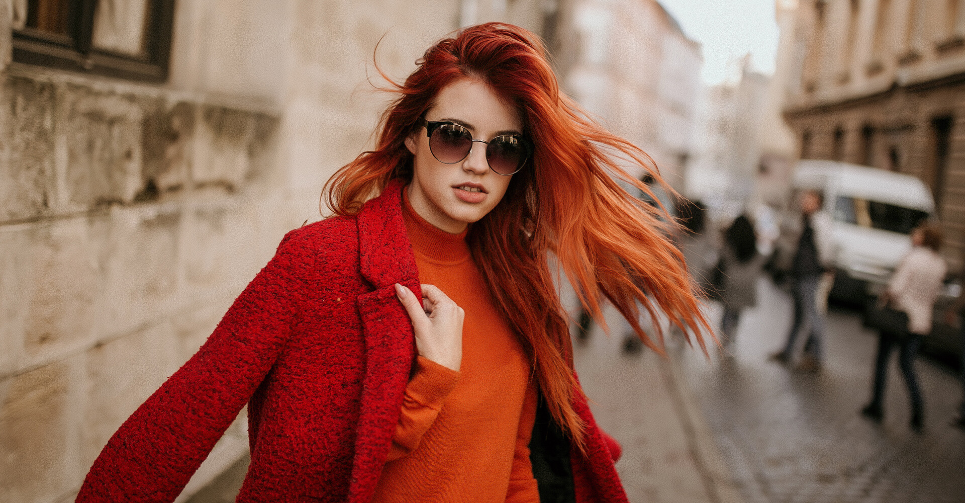 Let's consider another photo. In it, Olia Shelby paired an orange wool sweater with a brightly red coat, creating an incredibly bold and vibrant look. Again, the outfit is wonderfully complemented by stylish brown sunglasses and the girl's hair, which appears bright orange in the photo.